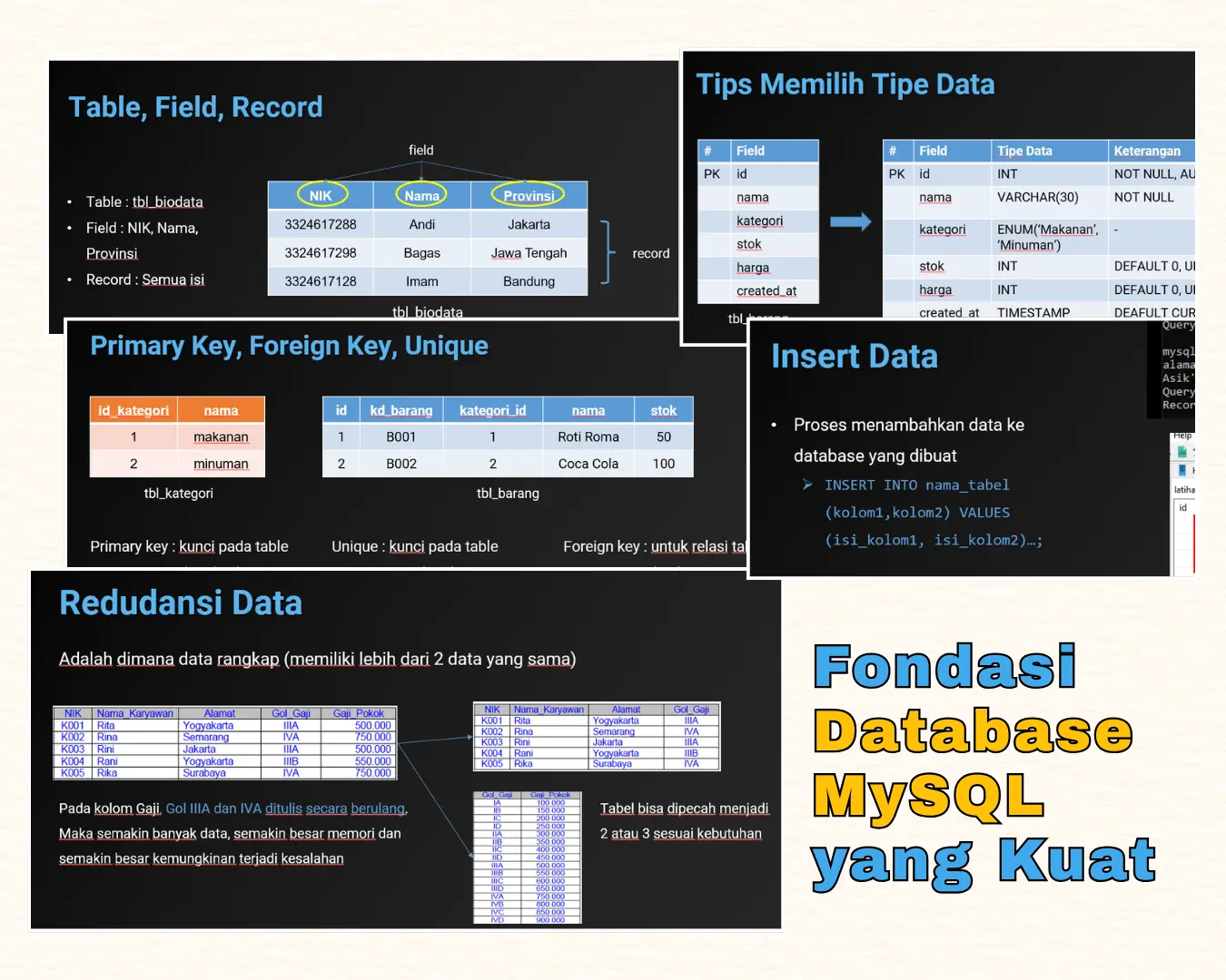 Belajar database dari konsep, normalisasi, DDL, DML, join, transaction, sampai backup & restore.